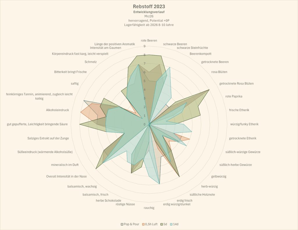 Nach 4-8 Tagen der Sweetspot. Der Flasche wurden bis zu diesem Zeitpunkt 1/3 bis die Hälfte entnommen, jeweils wiederverschlossen, gekühlt gelagert. Das lässt auf Reifefähig schließen, denn angefangen nachzulassen hat er erst nach mehr als 12 Tagen.